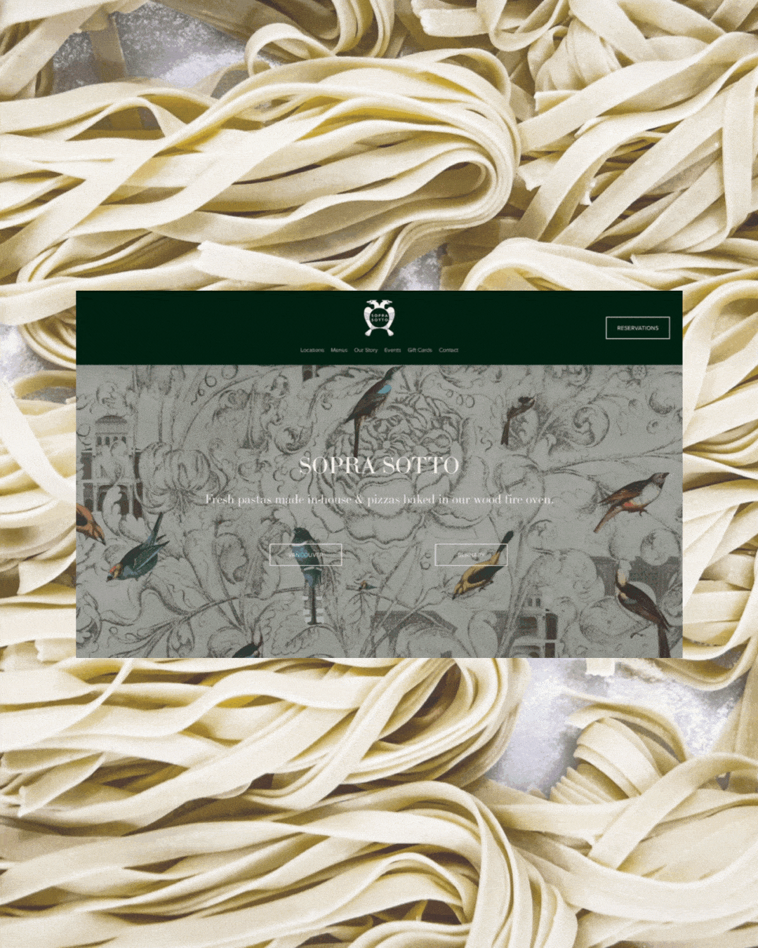 The scope: Squarespace Website Design, flodesk set up, menu design, print and digital Collateral Design, posters and banners designSopra Sotto is a modern Italian restaurant in Vancouver, BC, offering a warm and lively atmosphere where fresh ingredients and traditional recipes come together with contemporary flair. Known for its handmade pastas, wood-fired pizzas, and welcoming hospitality, it brings a taste of Italy to the heart of the city.